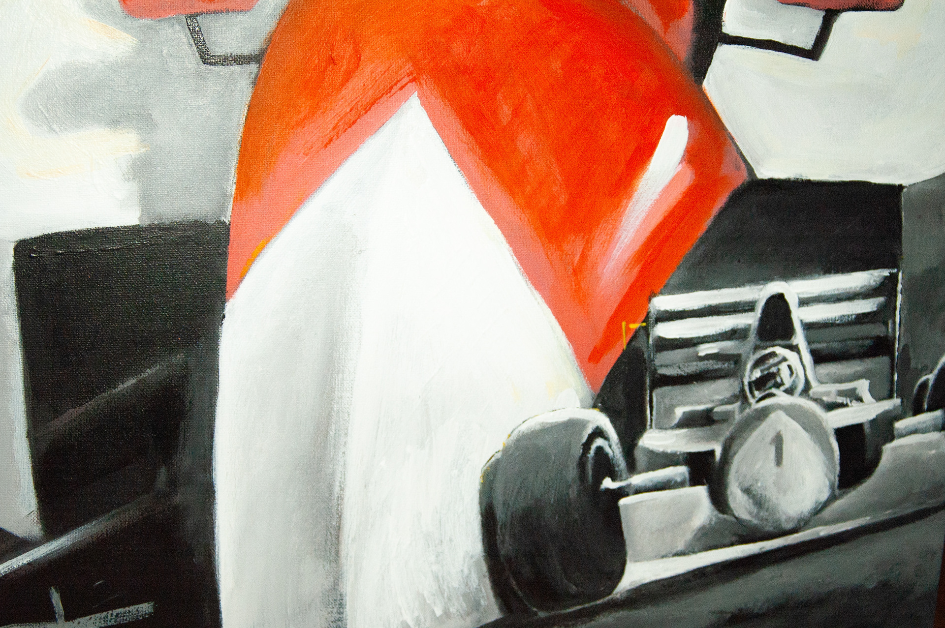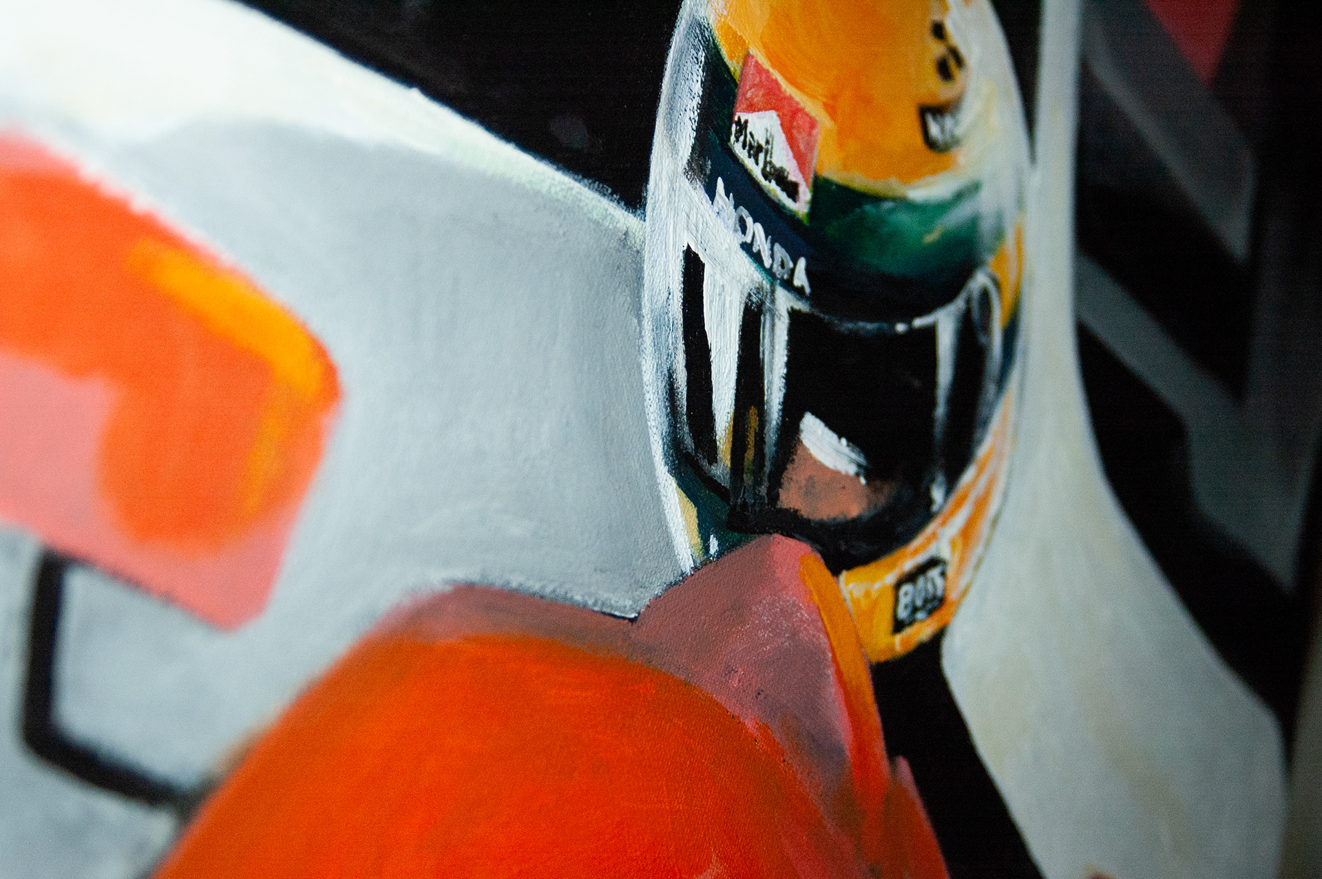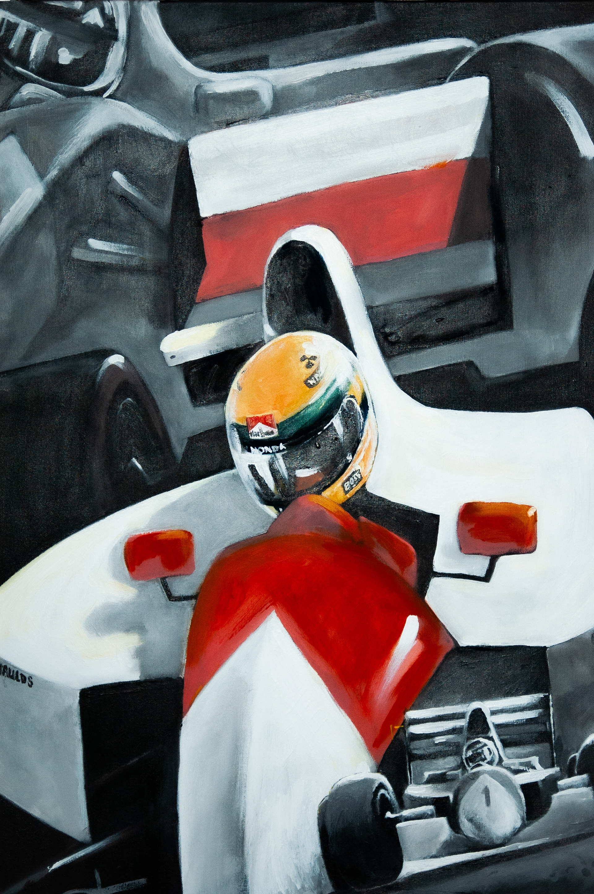 Presented is a painting of Ayrton Senna, perhaps the most renowned Formula 1 driver.